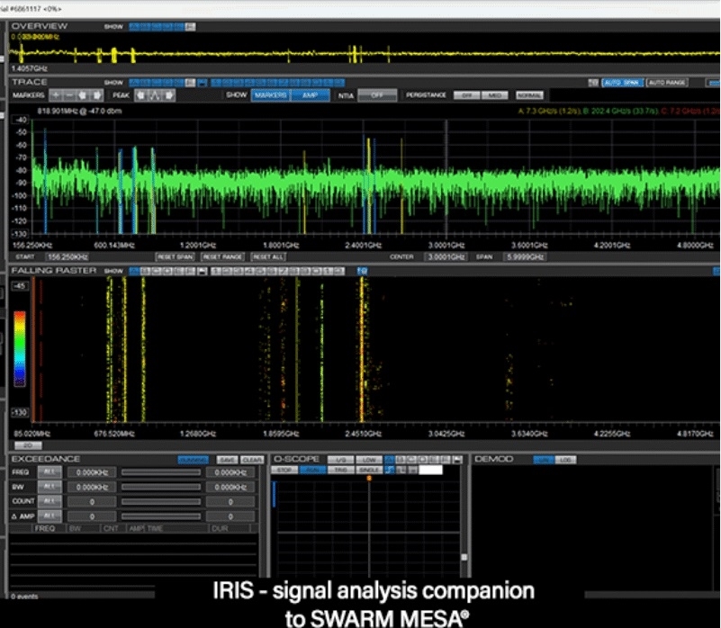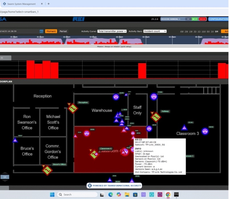 SWARM MESA® collects short- or long-term Missions that detect, alert, record, and analyze RF/WiFi activity in Areas of Interest (AOIs). SWARM MESA® quickly observes where and when RF events occur and issues alerts when devices transmit. MESA® spectrum analyzer devices can also be used to scan AOIs to capture transmission data and locate suspicious devices.