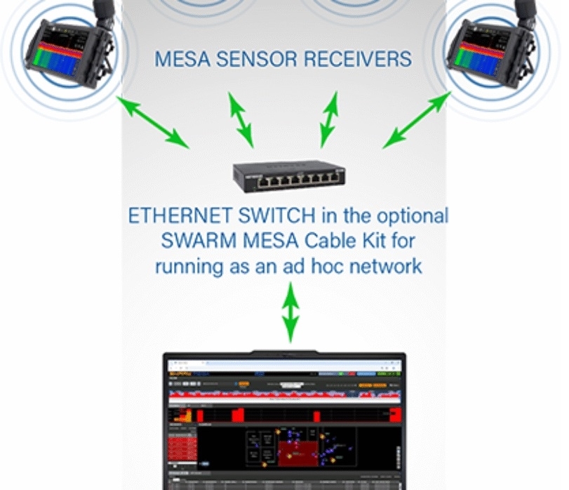 SWARM MESA® is a portable, easy-to-transport on-site monitoring system that connects multiple MESA® spectrum analyzer devices to a SWARM software control unit. The SWARM MESA® network provides continuous 24/7 RF and WiFi monitoring of facilities, environments, and events to detect and locate known, unknown, and unwanted transmissions.